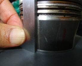 (2)除第一缸活塞有一道划痕外,其余活塞未见损伤。第一缸活塞的划痕自活塞底边起向上通到第三道油环处,上粗下细,裙部底边有一宽度为13mm的破损缺口,自划痕中间有一道斜向的裂纹,裙部表面还有较多的不明显的划痕和点状痕迹(图八)。将活塞放置于平板之上,用直角尺标定,划痕与直尺之间有明显夹角约4.2度,划痕在活塞底边处与标尺相距2mm(图九)。那么即使有硬质颗粒进入缸内,出现的划痕应垂直于活塞底边,自划痕中间的斜向的裂纹,应是由于强烈的局部外力所致,裙部表面有较多的不明显的划痕和点状痕迹为外来物击打造成,发动机缸内进水后强烈的受力部位集中在活塞销与活塞顶部之间,活塞右侧的承压为面受力而不是点受力,不会出现底边掉一块的现象。